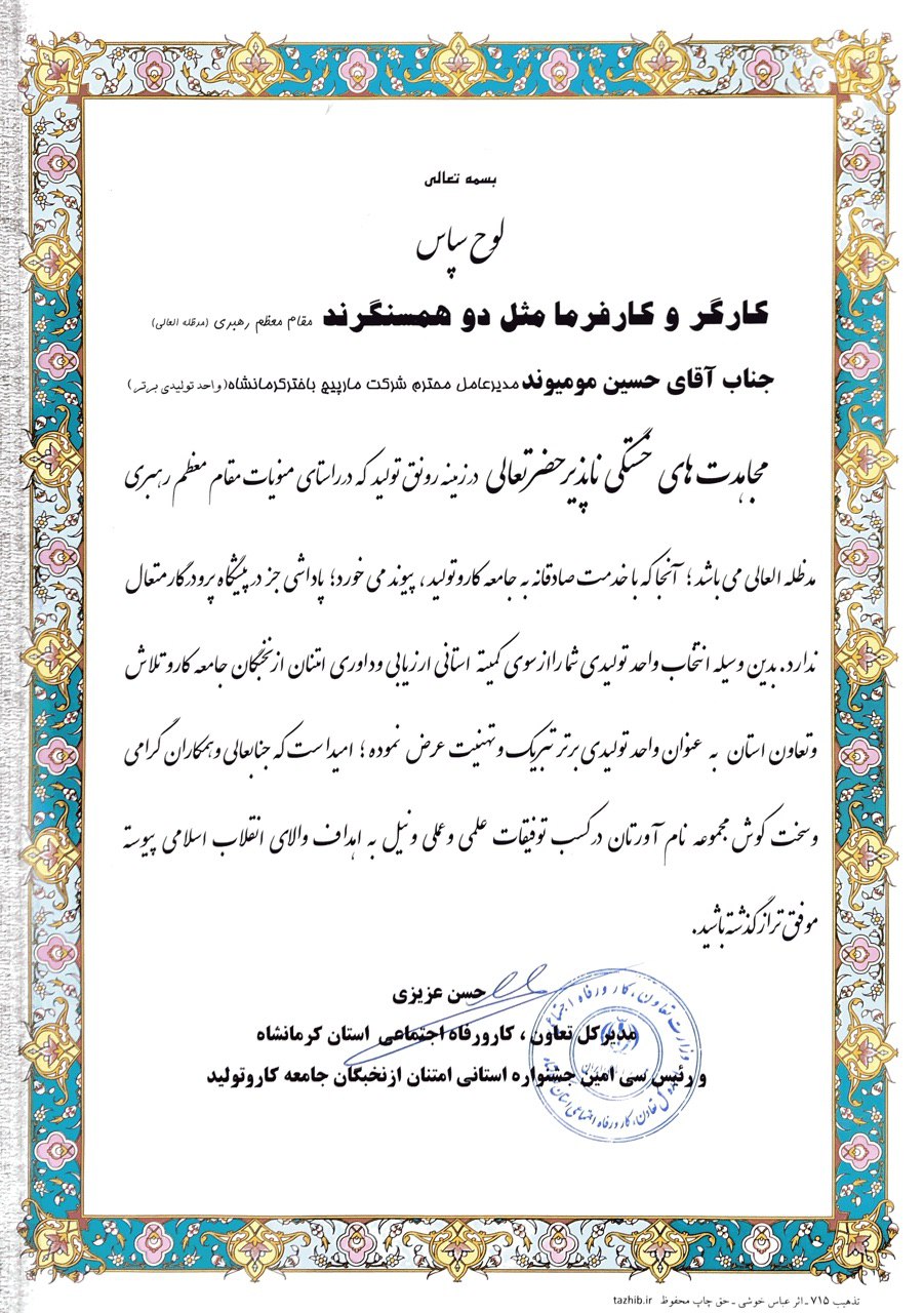 انتخاب شرکت مارپیچ باختر MBC به عنوان واحد تولیدی برتر در جشنواره امتنان از نخبگان جامعه کار و تولید در اردیبهشت سال 98