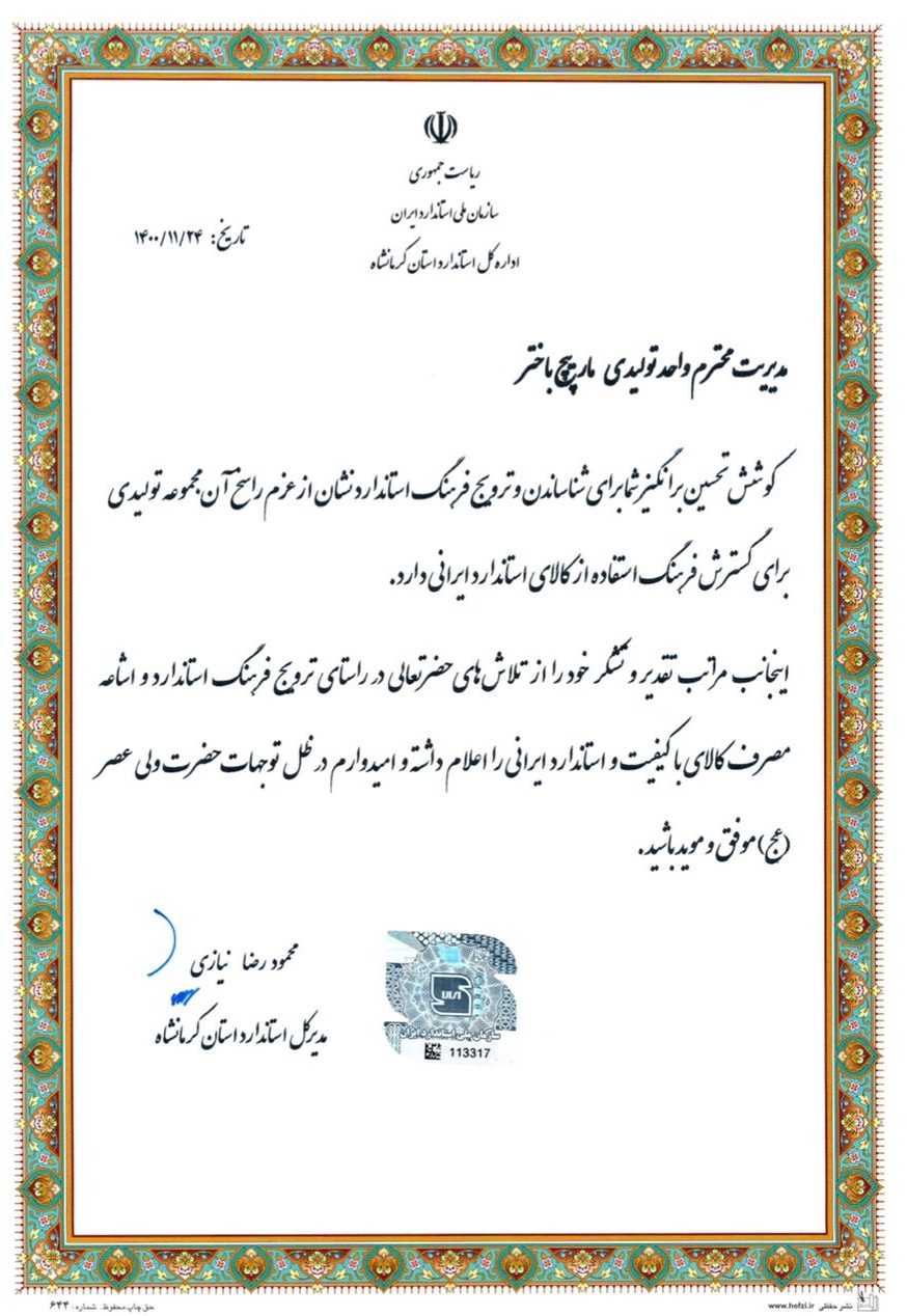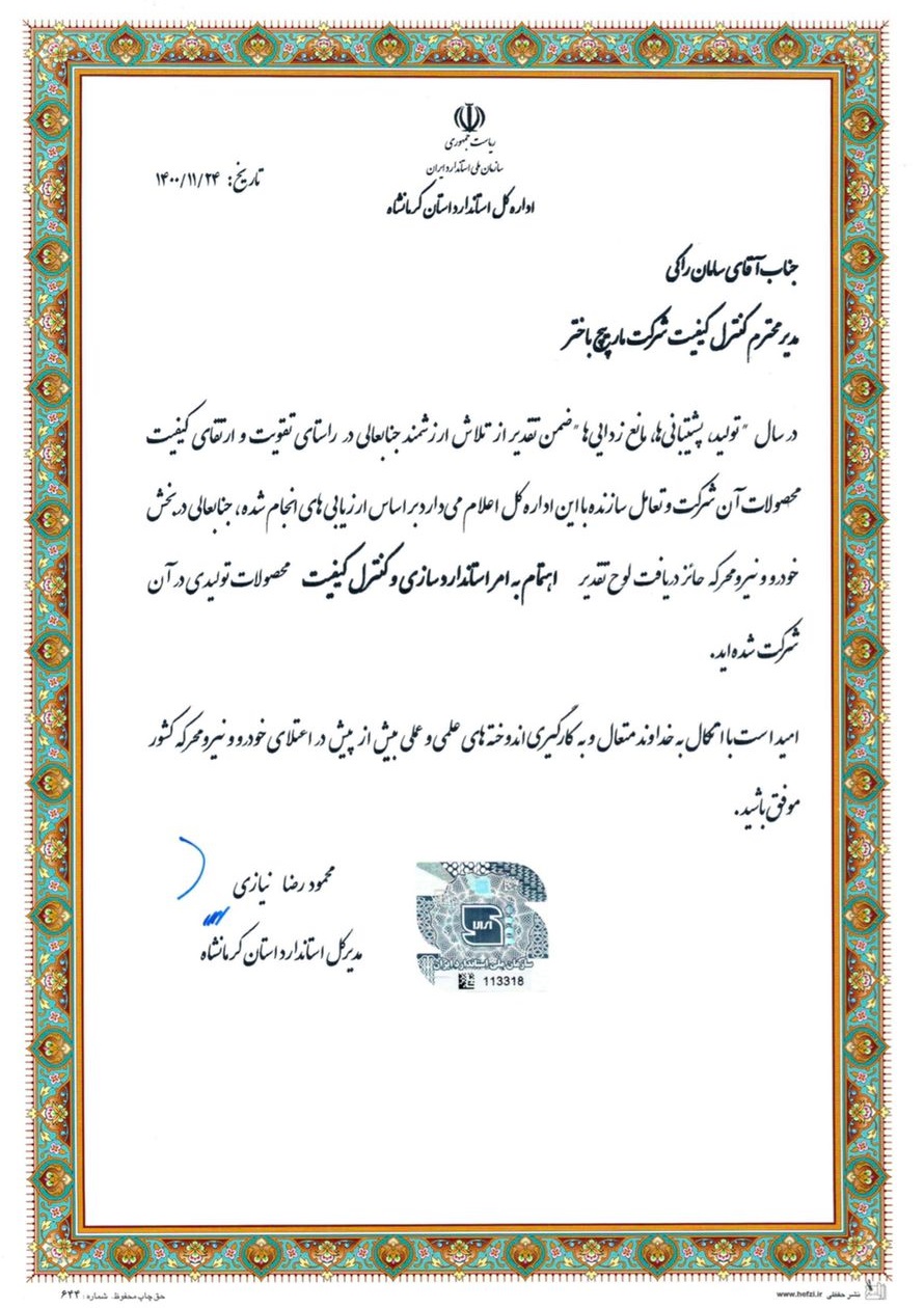 انتخاب شایسته شرکت مارپیچ باختر و مدیر کنترل کیفیت این واحد به عنوان واحد نمونه و مدیر کنترل کیفیت از سوی سازمان ملی استاندارد استان کرمانشاه در سال تولید، پشتیبانی ها، مانع زدایی ها در بخش خودرو و نیرو محرکه نشان از عزم راسخ این مجموعه برای گسترش فرهنگ استفاده از کالای استاندارد ایرانی دارد.