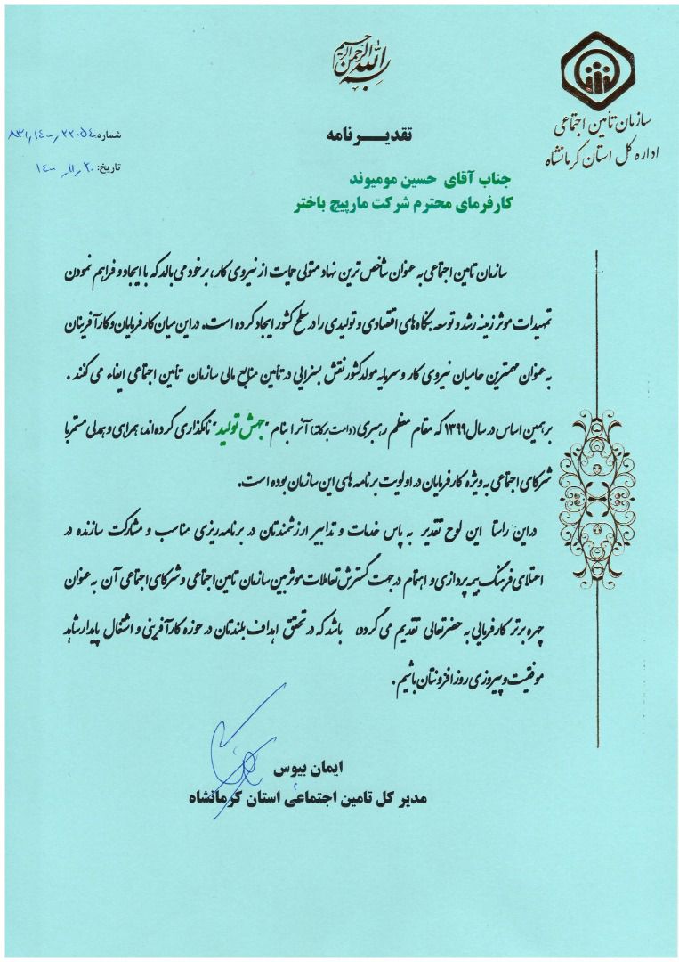 انتخاب شرکت مارپیچ باختر به عنوان چهره برتر حوزه کارآفرینی در سال 1400 از طرف سازمان تامین اجتماعی با حضور مهندس بیوس مدیر کل تامین اجتماعی استان کرمانشاه به همراهی معاونین محترم تامین جتماعی