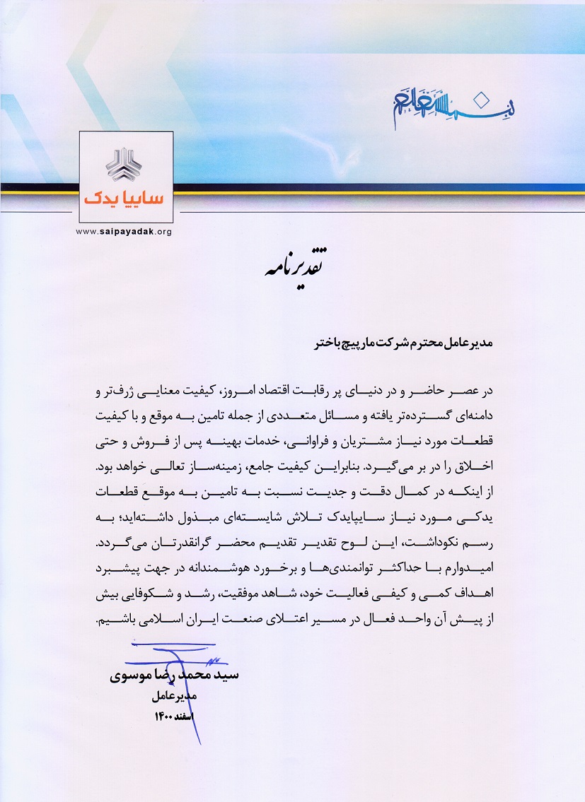 انتخاب شرکت مارپیچ باختر (MBC) به عنوان تامین کننده برتر سایپا یدک در سال 1400
