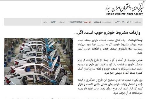 مصاحبه مدیر کارخانه شرکت مارپیچ باختر (MBC) با خبرگزاری دانشجویان ایران (ایسنا) در خصوص موضوع طرح واردات خودرو در برابرصادرات خودرو و قطعات آن