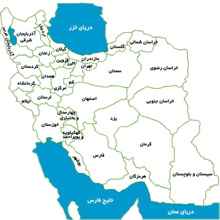 تهران اصفهان یزد خوزستان کرمان خراسان رضوی خراسان جنوبی خراسان شمالی همدان قزوین قم گلستان مازندران آذربایجان غربی آذربایجان شرقی فارس اردبیل بوشهر لرستان زنجان سیستان و بلوچستان هرمزگان کهگیلویه و بویراحمد چهارمحال و بختیاری البرز سمنان کردستان